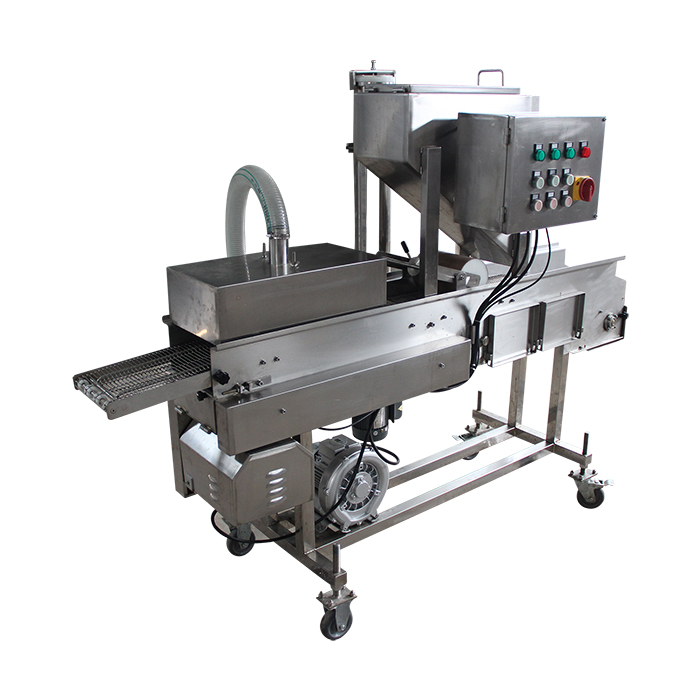 裹漿后產(chǎn)品進入下網(wǎng)帶,底部及側(cè)面沾滿面包屑,從上料斗流下的面包屑將產(chǎn)品上部覆蓋,經(jīng)壓輥壓緊(上下網(wǎng)帶上的面包屑厚度可以方便調(diào)節(jié)),上康后經(jīng)風機,將多余的面包屑吹落。進入下一道程序。