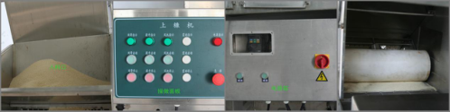 上面包屑機(jī)是通過(guò)料斗里泄出來(lái)的面包屑和網(wǎng)帶床身上的面包屑將面包糠均勻涂裹在產(chǎn)品上;再經(jīng)過(guò)壓輥時(shí),面包屑被壓附在產(chǎn)品上;經(jīng)過(guò)風(fēng)刀時(shí),多余的粉被吹落;最后將產(chǎn)品輸送到下一工序。