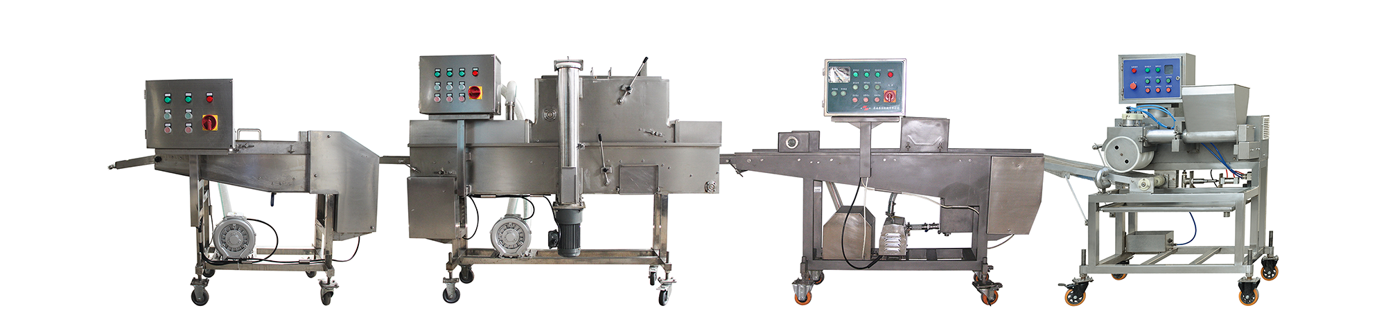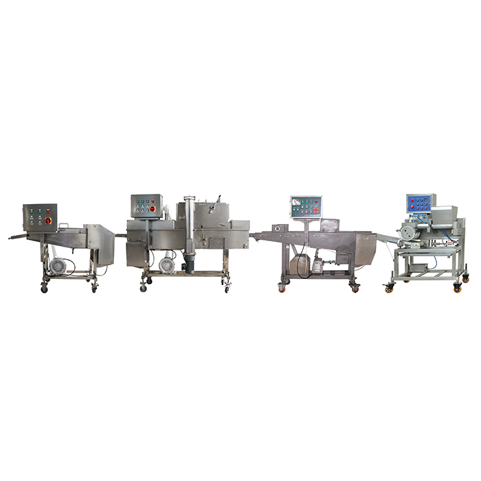 雞塊生產線把混合好的原料經過成型,上稀漿,上粉,上稠漿,油炸,速凍等工藝做出不同厚度不同規(guī)格的雞塊。模具可以生產不同形狀的產品(如三角形,橢圓形,卡通雞塊形狀,不規(guī)則形狀)通過模具更換產品。卡通雞塊生產線適用于肉類、水產、蔬菜、奶酪以及它們混合料。肯德基雞塊生產線的需要配置前處理設備和后處理設備:絞肉,混合,油炸包裝等設備,麥當勞雞塊生產線與這些配套設備組成一條完整的快餐調理生產線。